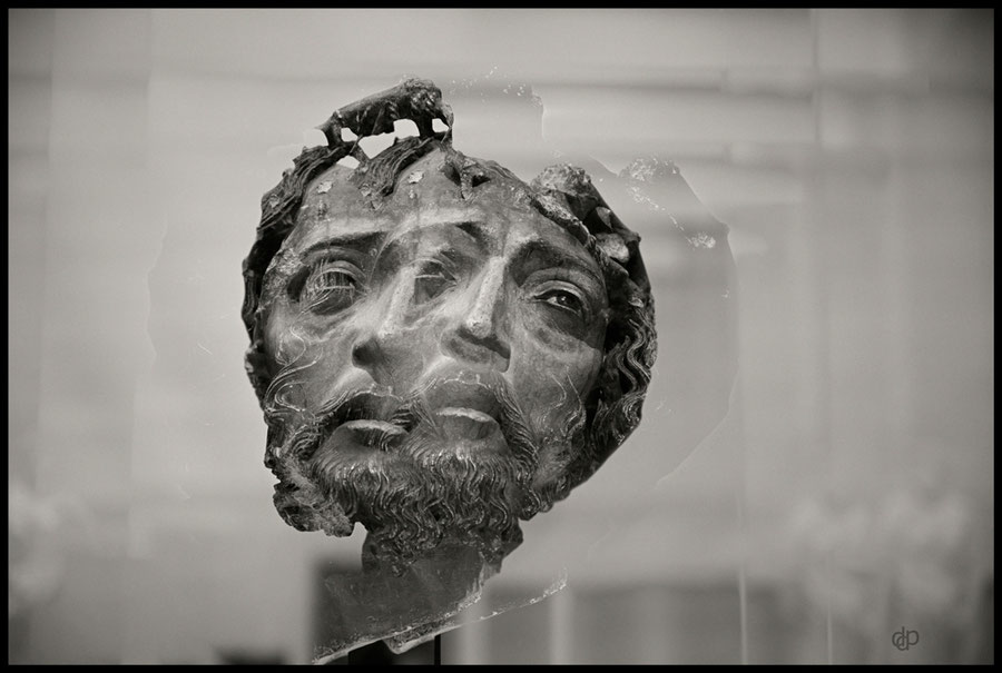 Ici, les colonnettes du cloître se reflètent dans la vitre qui protège la tête de Saint-Jean Baptiste.